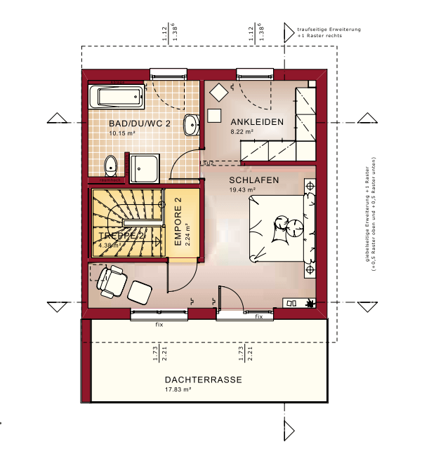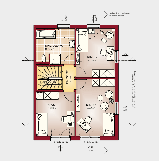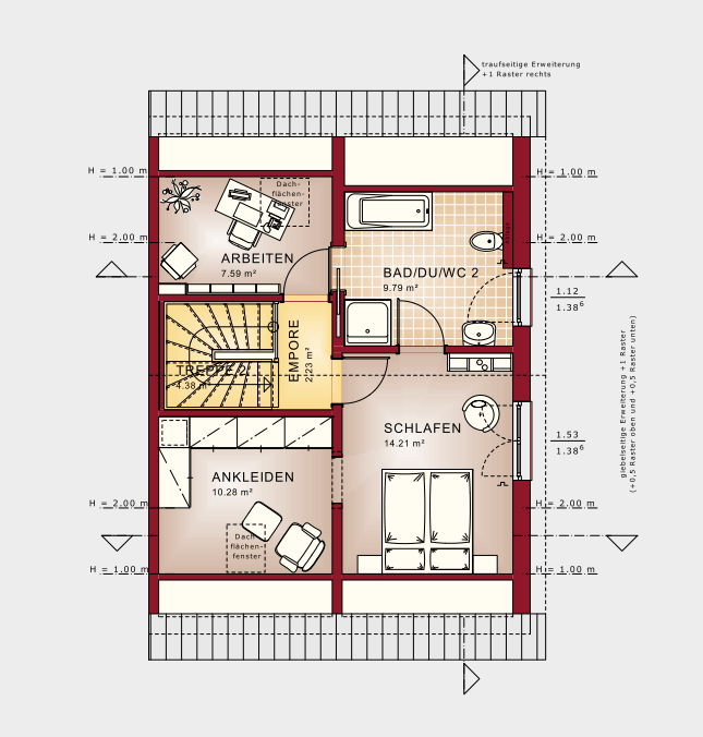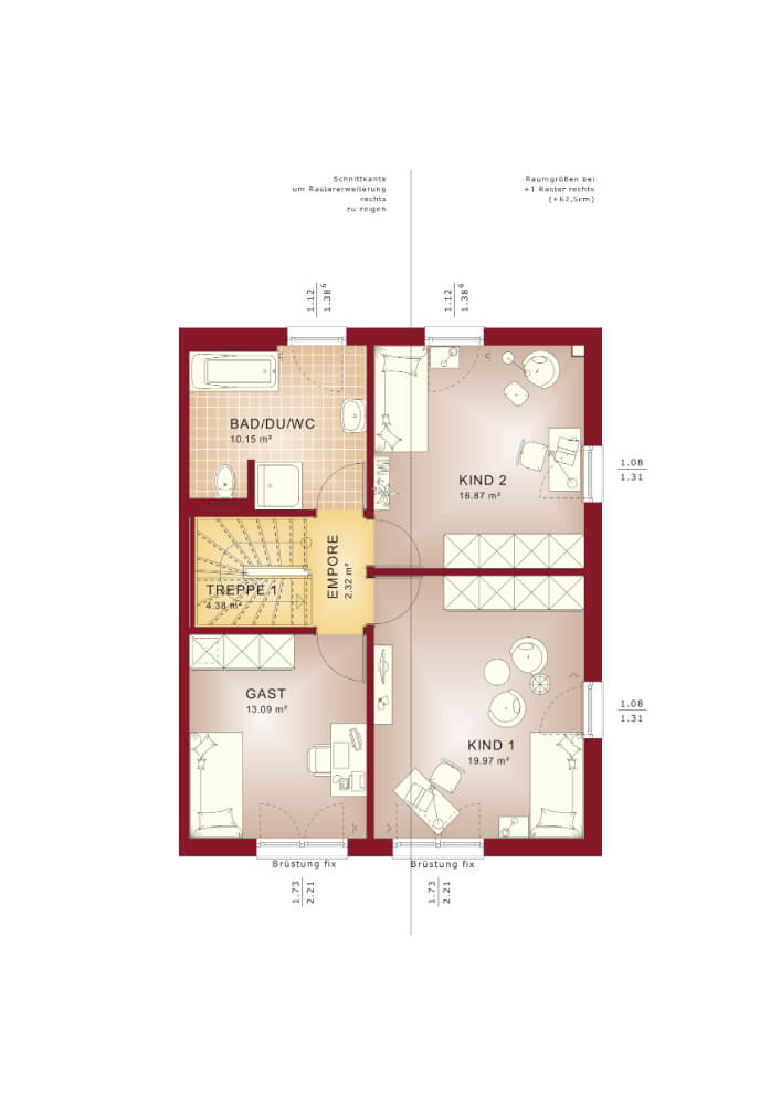 In der Ausführung mit 3 Geschossen beherbergt das 1. Obergeschoss die Schlafräume für Kinder und Gäste mit eigenem Bad. Das 2. Obergeschoss wird zu einem großzügigen Elternschlafzimmer mit Ankleide und Bad.